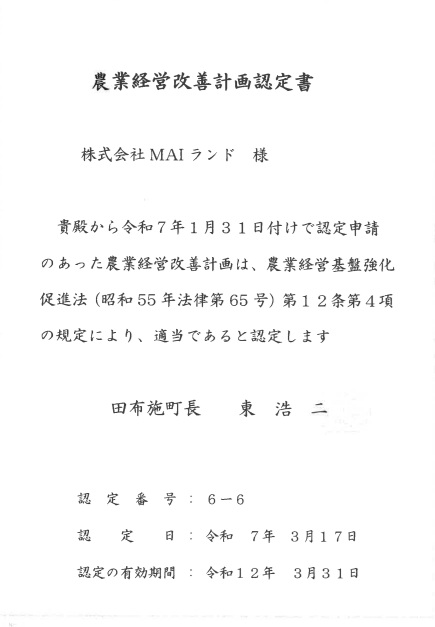 この度は、MAIランドを含めた県内企業3社が田布施町の認定を受け、地域農業の発展や地域の活性化に取り組んでいきます。